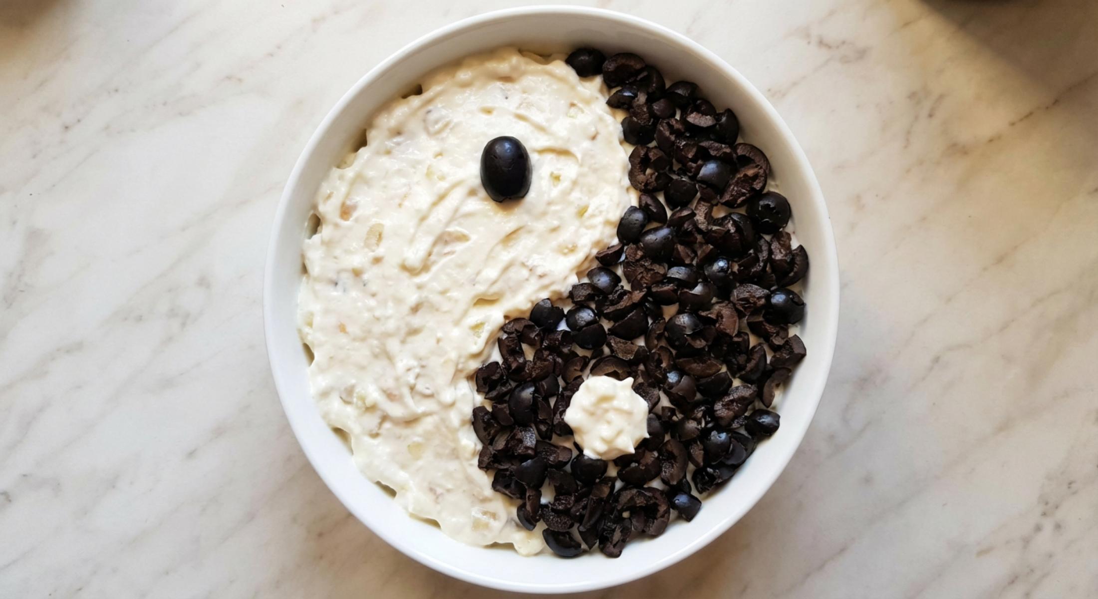 Символ инь-янь олицетворяет баланс противоположностей. В этом салате — баланс вкусов (солёное и нежное, пикантное и сливочное), текстур (мягкое и упругое), цветов (чёрное и белое). Это не просто еда — это философия на тарелке!