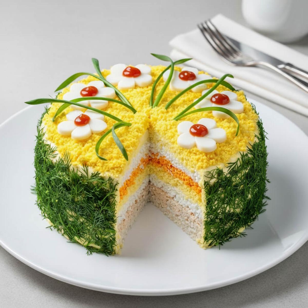 - Это яркий представитель 'салатов-тортов' - блюд, которые выкладываются слоями и требуют аккуратного оформления, что делает их похожими на кондитерские изделия.