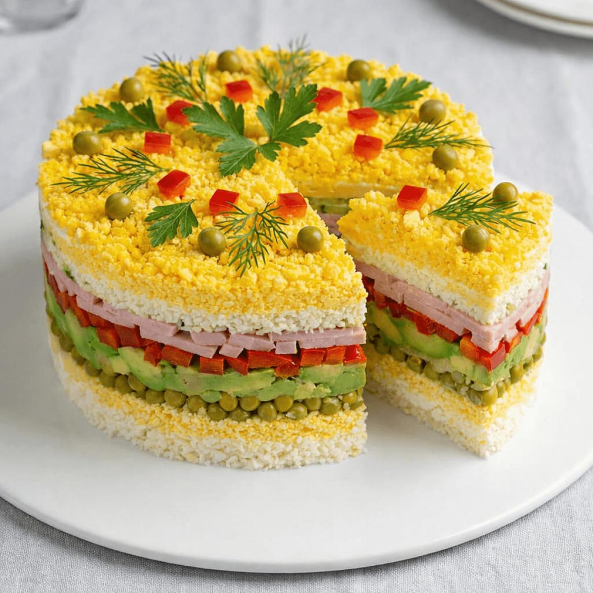 - В каком порядке лучше выкладывать слои? Порядок важен, чтобы вкусы гармонировали. Обычно снизу кладут нейтральные ингредиенты (белки), затем сыр, потом более яркие (горошек, авокадо, перец, ветчина, огурец) и сверху снова сыр и желтки. Но можно экспериментировать.