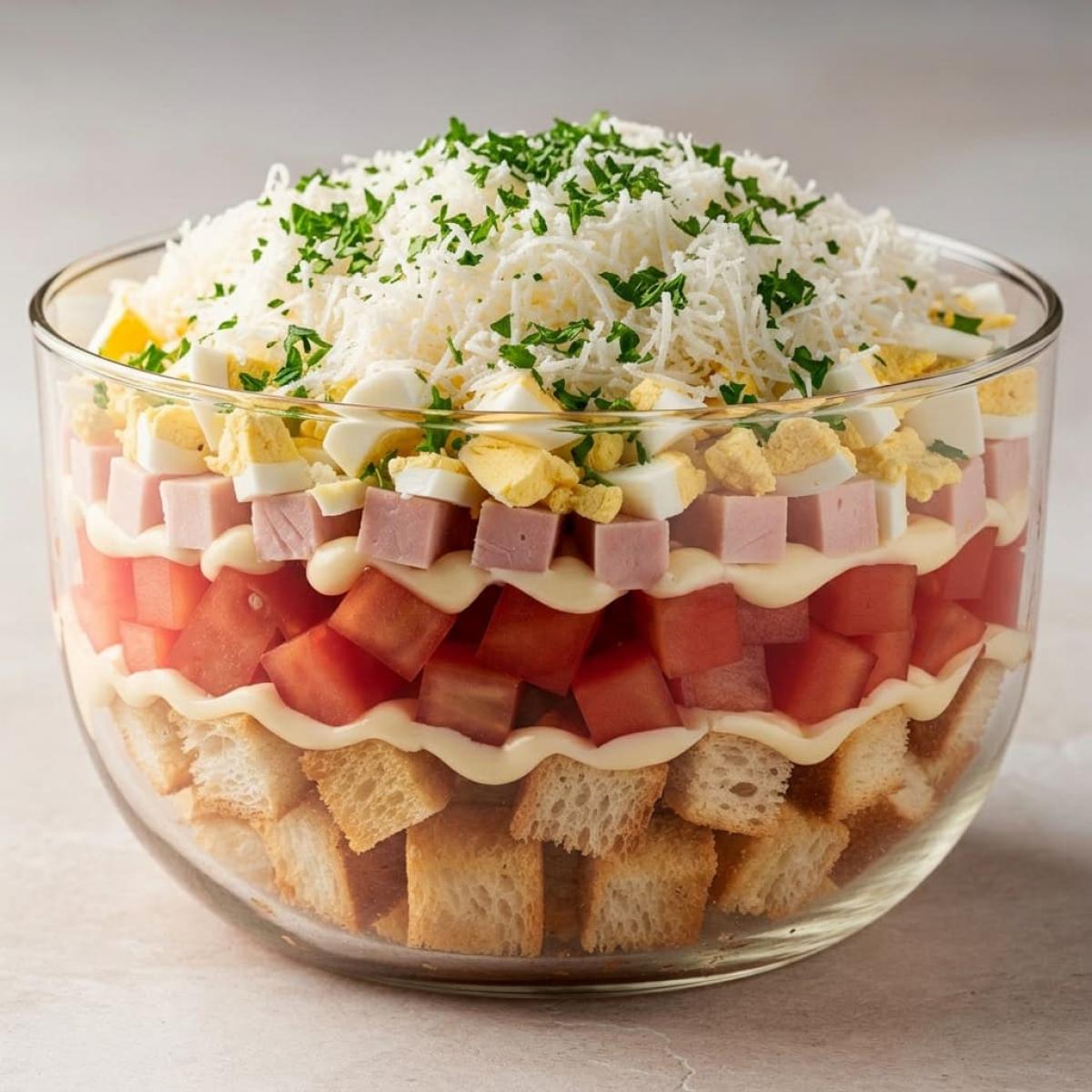 - 5. Сборка салата: Возьмите красивую салатницу или прозрачную миску, чтобы были видны слои. Выкладывайте слои в следующем порядке: - 1-й слой: сухарики. Распределите их ровным слоем по дну. Смажьте тонкой сеточкой майонеза. - 2-й слой: нарезанные помидоры. Распределите равномерно. Смажьте майонезом. - 3-й слой: нарезанная кубиками ветчина. Смажьте майонезом. - 4-й слой: рубленые яйца. Этот слой майонезом смазывать не нужно. - 5-й слой: тертый сыр. Распределите равномерно, покрывая всю поверхность.