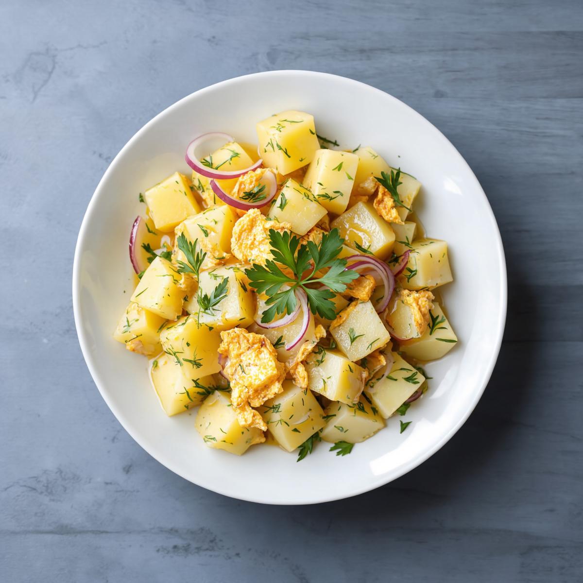 Картофель и яйца - это классическое сочетание, знакомое каждому с детства. Но что, если взглянуть на него по-новому и превратить в изысканный тёплый салат? Тёплый салат из картофеля и омлета - это именно то блюдо, которое удивляет своей простотой и необычностью. Впервые я попробовал его в небольшом семейном кафе в австрийских Альпах, где его подавали как сытное дополнение к колбаскам. Нежный, рассыпчатый картофель, мягкие кусочки воздушного омлета, хрустящий лук и свежая зелень, объединённые лёгкой заправкой, - это было невероятно вкусно и уютно. С тех пор я часто готовлю этот салат дома. Он прекрасен сам по себе, как основное блюдо, или как оригинальный гарнир к мясу или рыбе. Готовится просто и быстро, а результат всегда радует.