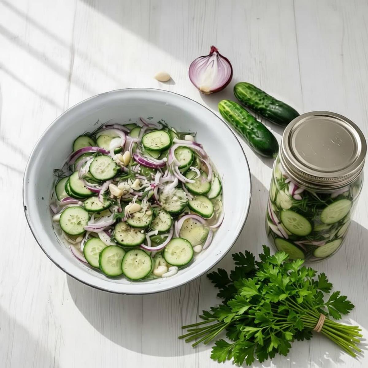 - 3. Смешивание овощей: Сложите нарезанные огурцы и лук в большую глубокую эмалированную кастрюлю или таз. Эмаль или нержавейка - идеальный вариант, так как они не окисляются от уксуса.