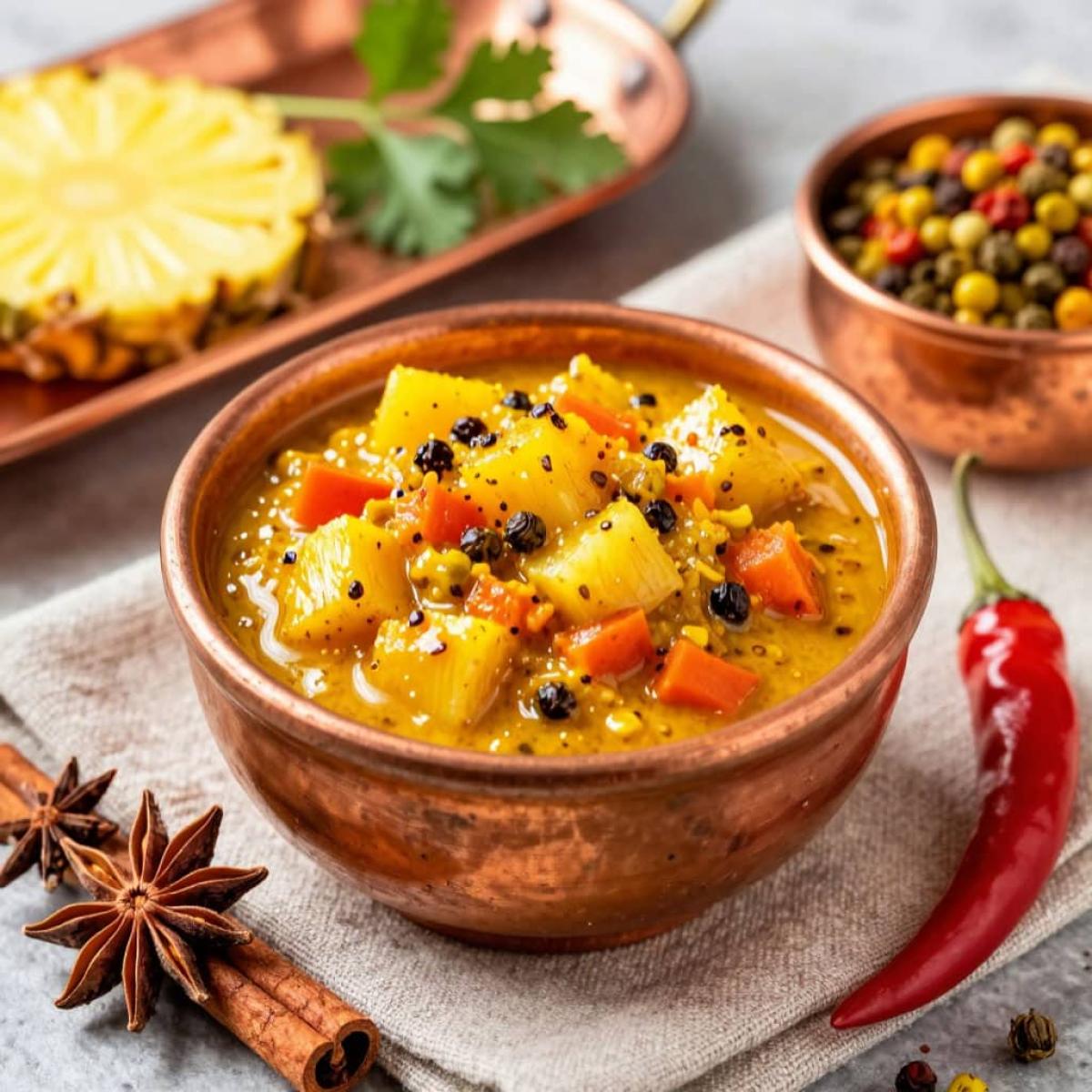 Сегодня мы отправляемся в Индию - страну пряностей, ярких красок и удивительных вкусов. Мы будем готовить чатни. Не тот, что продается в магазинах в маленьких баночках, а настоящий, домашний, приготовленный с любовью и специями. Что такое чатни? Это не просто соус, это целая философия. Это сладкое, острое, кислое и пряное великолепие, которое способно преобразить любое блюдо. В Индии чатни готовят из самых разных фруктов и овощей, с добавлением сахара, уксуса и специй. Наш рецепт - яркий тому пример. Мы возьмем сочный ананас, добавим к нему морковь, сладкий перец, лук, яблочный сок, сахар и целый букет специй. Все это будет томиться на медленном огне около часа, превращаясь в густую, ароматную, умеренно острую массу. Потом мы пробьем ее блендером - и чатни готов! Его можно подавать к курице, мясу, рыбе, сырам или просто намазывать на хлеб. А приготовленный впрок, он станет прекрасным напоминанием о лете. Готовить чатни совсем не сложно, хотя и требует немного терпения. Я подробно расскажу вам обо всех этапах.