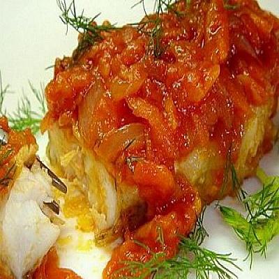 Рецепт рыбы, запеченной под острым овощным соусом, хорош тем, что это блюдо не требует дополнительного гарнира. К тому же, даже если рыба суховата, овощной соус придаст ей сочность и ароматность.Подготовка овощей:- лук чеснок и острый перец мелко нарезать- бланшированные помидоры очистить от кожицы, мякоть измельчить- сладкий перец нарезать соломкой- лук, чеснок и оба вида перцев пассировать в оливковом масле- через 5 мин. добавить помидоры- сбрызнуть бальзамическим уксусом (можно лимонным соком)- тушить на слабом огне еще 5 мин.- в горячую овощную массу добавить нарезанные половинками маслины и свежую зелень.Рыбу нарезать порционными кусками и уложить в форму для запекания. Сверху выложить овощной соус.Запекать 25-30 мин. в предварительно разогретой духовке.