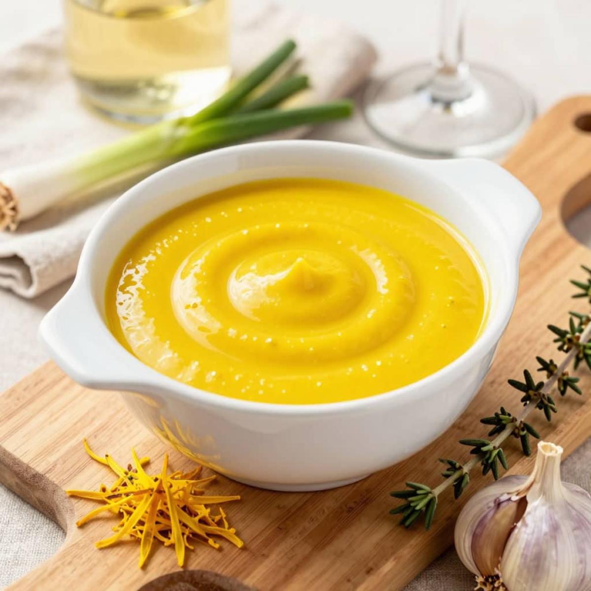 Приготовление этого соуса потребует времени и внимания, но каждый этап важен. Сначала подготовим лук-порей. Нарежем его кольцами и выдержим в холодной воде 20 минут, чтобы ушла горечь. Затем займемся шафраном: зальем его двумя ложками горячей воды и оставим настаиваться. Тем временем мелко нарезанный лук (репчатый или белую часть порея) пассеруем в сливочном масле до прозрачности. Добавляем к нему измельченный чеснок и тимьян, заливаем белым вином и прогреваем 15 минут. Затем добавляем мелко натертую морковь и подготовленный лук-порей, вливаем овощной бульон, накрываем крышкой и тушим 20 минут. После этого даем овощной массе остыть и пюрируем блендером. Возвращаем пюре в сковороду, добавляем лимонный сок и настоянный шафран. Вливаем сливки, хорошо размешиваем. Отдельно разводим кукурузный крахмал в холодной воде и, постоянно помешивая, тонкой струйкой вливаем в соус. Доводим до кипения и провариваем 5 минут до загустения. Соус готов! Подавать горячим.