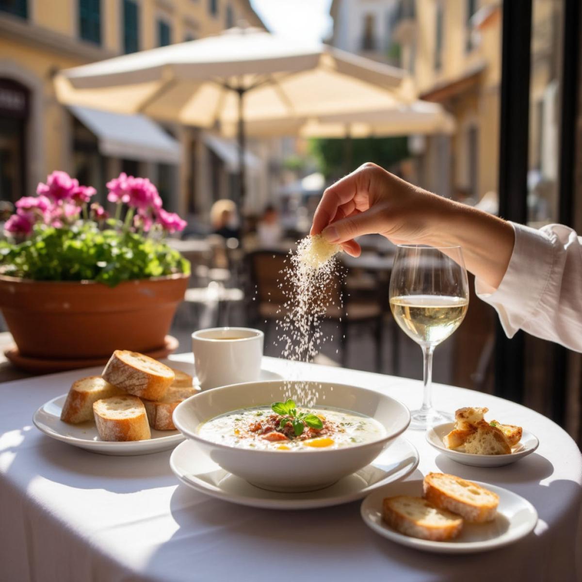 Подача страчателлы должна быть простой и элегантной, как само блюдо. Я люблю подавать его в белой фарфоровой чашке, чтобы были видны золотистые хлопья яйца и зелень. Рядом можно положить ломтик поджаренного чиабатты или грубого хлеба, который идеально подходит для того, чтобы макать его в бульон. Идеальный напиток-компаньон — бокал легкого белого вина (например, Пино Гриджио) или просто стакан чистой воды.