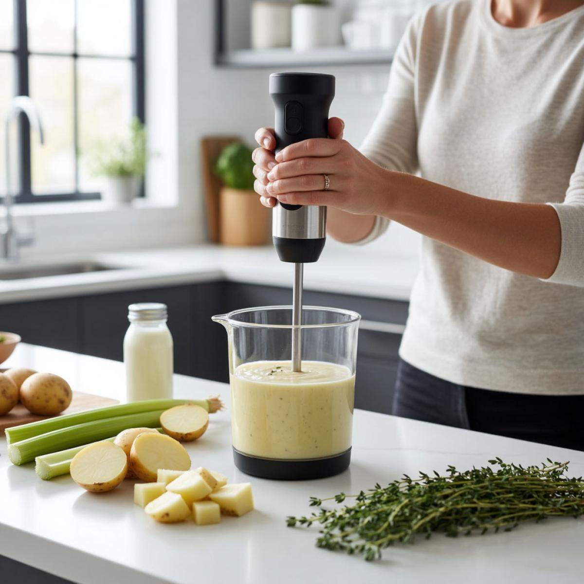 - Превращение в пюре. Снимаю кастрюлю с огня и даю супу 5 минут остыть. Затем с помощью погружного блендера измельчаю все содержимое до состояния идеально гладкого, однородного крема. Если блендера нет, можно осторожно перелить суп в чашу стационарного блендера или протереть через сито с мелкими ячейками. Второй вариант дольше, но позволяет добиться особенно шелковой текстуры, без единого волокна.