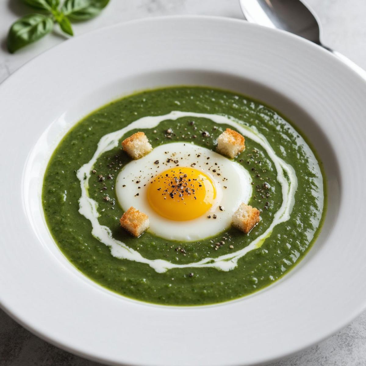 Подача этого супа должна подчеркивать его изысканность. Я люблю использовать белую или черную глубокую тарелку, чтобы контраст с зеленым супом и белым яйцом был максимальным. Рядом можно поставить маленькую тарелочку с тонкими тостами из чиабатты или хлебными палочками (гриссини). В отдельной пиале можно подать легкий салат из рукколы с лимонным соком. Напиток-компаньон - бокал сухого белого вина (например, Совиньон Блан) или стакан холодной негазированной воды с долькой лайма.