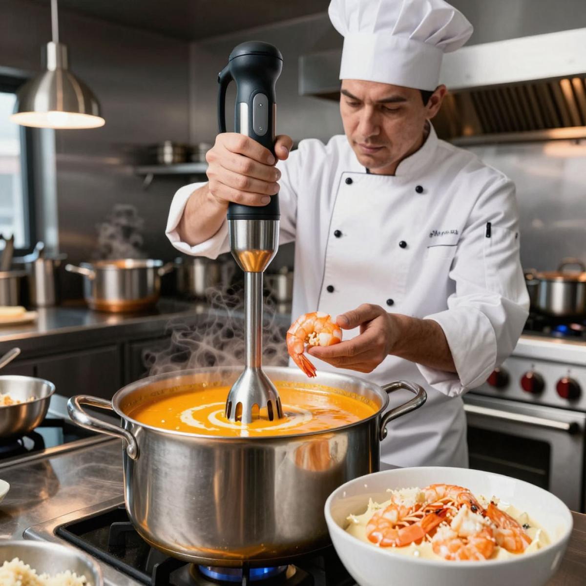 - 3. Создание супа-пюре: Влейте в овощи белое вино, выпарьте алкоголь на сильном огне (1-2 мин). Медленно влейте горячий процеженный креветочный бульон, постоянно помешивая, чтобы не было комков. Варите 10 минут на среднем огне. Добавьте сливки, доведите до кипения и сразу уберите с огня. Погружным блендером превратите суп в абсолютно гладкое пюре. Верните на слабый огонь, добавьте очищенные креветки и варите 2-3 минуты, пока они не станут розовыми и не свернутся. Приправьте солью, белым перцем и щепоткой паприки.