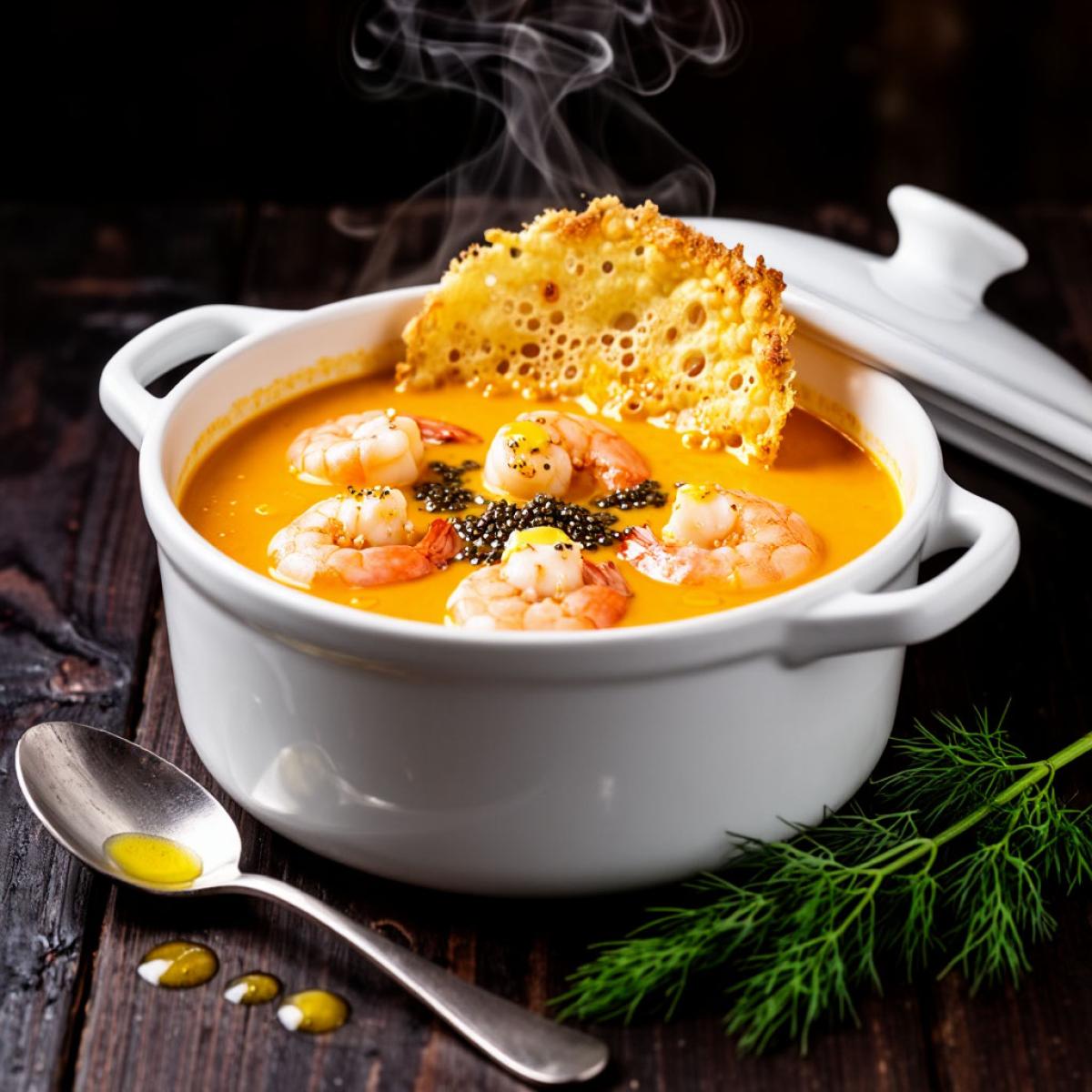 Традиция запекания супов и рагу в глиняной или керамической посуде насчитывает тысячелетия и есть во многих культурах — от русской печи до французского касуле. Однако именно крем-супы (bisques) из морепродуктов, особенно из омаров и креветок, стали визитной карточкой французской изысканной кухни XVII-XVIII веков. Изначально их готовли из измельченных панцирей и остатков морепродуктов, чтобы ничего не пропадало, но со временем блюдо эволюционировало в деликатес. Наш рецепт в горшочках — это современная, элегантная интерпретация этой классики, сочетающая в себе глубину французского биска и очарование индивидуальной порционной подачи. Готовя его, мы прикасаемся к истории haute cuisine, но делаем это на своей кухне.