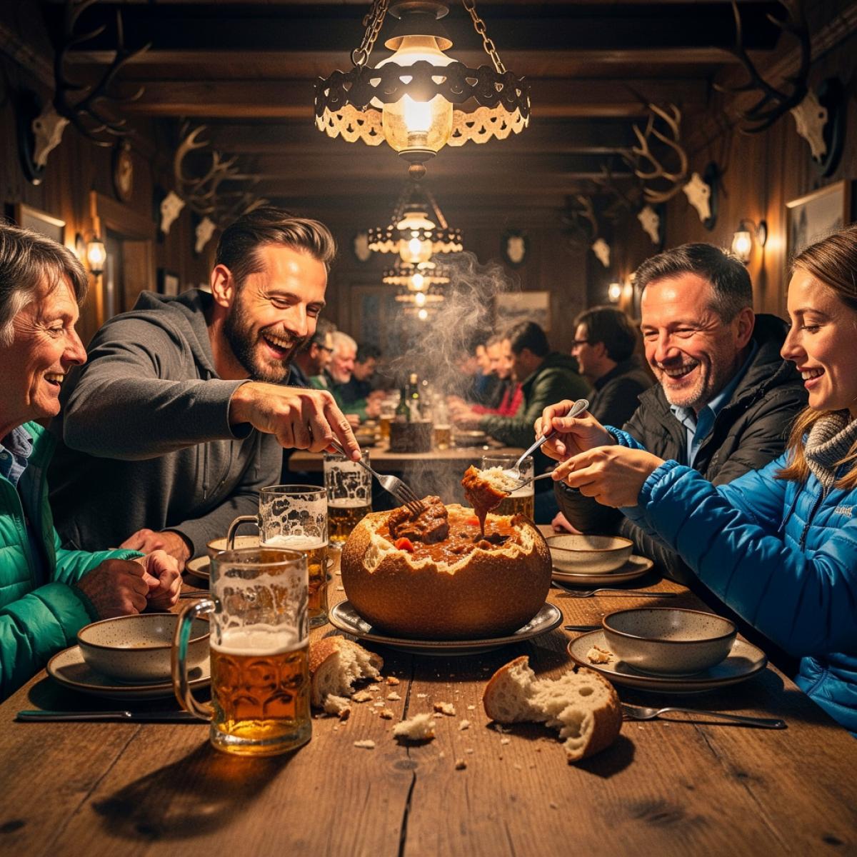 Это блюдо создано для того, чтобы его сервировали с душой и уважением к традиции. Подавайте его очень горячим. Классика — подача в съедобной хлебной миске (хлеб должен быть плотным, ржаным или зёрновым). Обязательно поставьте на стол дополнительную тарелку с нарезанным хрустящим хлебом. В Австрии к такому супу часто подают кнедлики (картофельные или хлебные) или просто отварной картофель. На стол можно поставить горчицу и хрен — они отлично оттеняют вкус жирного мяса. Идеальный напиток — тёмное австрийское или немецкое пиво (например, Märzen) или молодое красное вино (например, австрийский Цвайгельт).