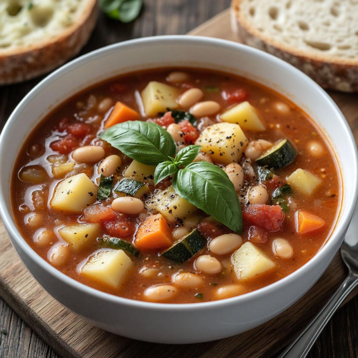 В Италии подача Минестроне — это ритуал. Разлейте густой суп по глубоким тарелкам. Главные штрихи: