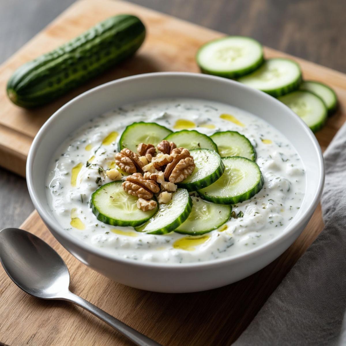 Таратор — это не только вкусно, но и невероятно полезно. Натуральный йогурт — источник высококачественного белка, кальция и пробиотиков, которые нормализуют микрофлору кишечника и улучшают пищеварение. Свежий огурец на 95% состоит из структурированной воды, богат калием и клетчаткой, способствуя увлажнению организма и мягкому очищению. Грецкие орехи содержат полиненасыщенные жирные кислоты омега-3, витамины и антиоксиданты, полезные для мозга и сердечно-сосудистой системы. Укроп обладает мягким мочегонным и противовоспалительным действием. Этот суп — идеальный легкий обед или ужин в жаркую погоду: он хорошо насыщает, не перегружая желудок, и помогает поддерживать водный баланс.