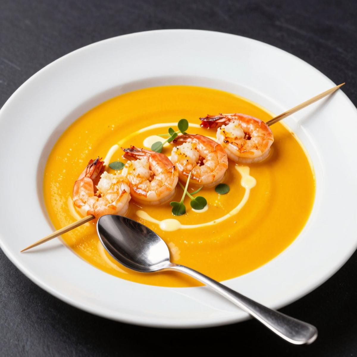 Тыквенные супы имеют многовековую историю в кухнях Нового Света (особенно в Мексике и США), где тыква была одним из основных продуктов. Однако соединение её с молочными продуктами и превращение в изысканный крем-суп — заслуга европейской, в частности французской, кулинарной традиции. Креветки же, как роскошный деликатес, добавили в рецепт позже, в эпоху глобализации и популярности фьюжн-кухни. Таким образом, это блюдо — современный гастрономический конструктор: американский овощ, обработанный по-французски и дополненный азиатской техникой приготовления морепродуктов. Оно отражает тенденцию современной кухни: искать баланс, играть на контрастах и создавать новые, неожиданные, но гармоничные вкусовые сочетания из глобальной кладовой.