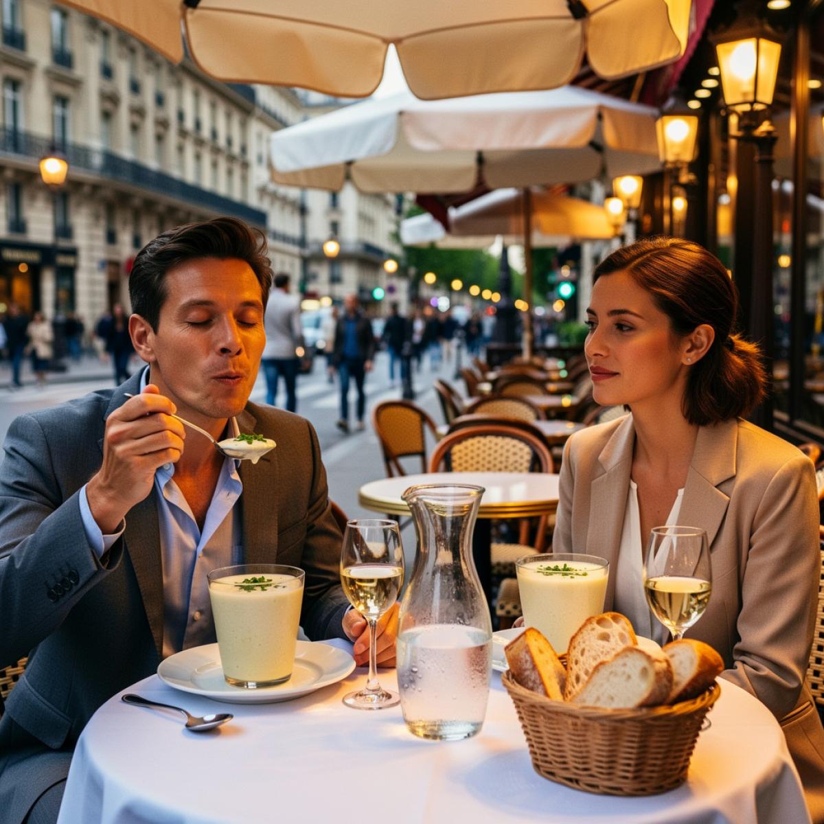 История Вишисуаза — это история миграции и кулинарной адаптации. Его прообразом считается простое блюдо французских крестьян и пастухов из Оверни — горячий картофельно-луковый суп «потаж бонн-фам» (суп хорошей жены). Во время Первой мировой войны шеф Луи Диа, эмигрировавший из Франции в США, вспомнил этот рецепт своего детства. По легенде, в жаркий летний день 1917 года в нью-йоркском «Ритц-Карлтоне» ему нужно было быстро накормить изысканную публику. Он подал охлажденный вариант супа, взбил его до состояния нежного крема, добавил сливок и дал звучное имя «Крем Вишисуаз Гласе» (охлажденный). Блюдо мгновенно покорило высшее общество и стало символом элегантной простоты. Это классический пример того, как гений шефа может превратить скромное деревенское блюдо в кулинарную икону.