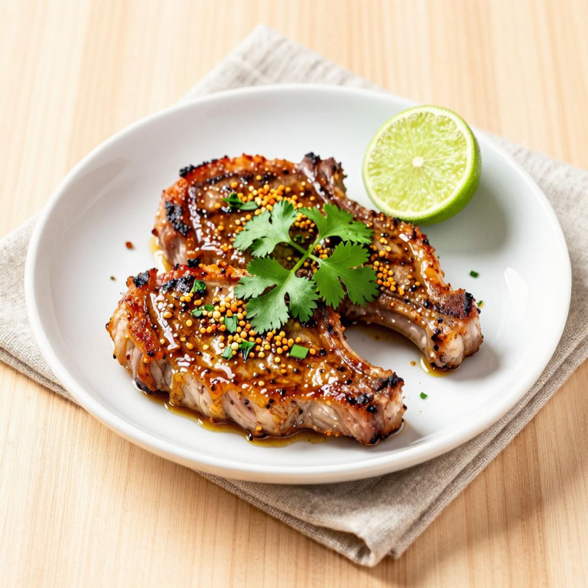 Свиные отбивные в пряном маринаде - это сытное и ароматное блюдо. Свинина - источник белка, витаминов группы B, железа и цинка. Имбирь улучшает пищеварение. Чеснок и петрушка укрепляют иммунитет. Лайм богат витамином C. Чтобы сделать блюдо более легким, выбирайте постную свинину и используйте меньше масла.