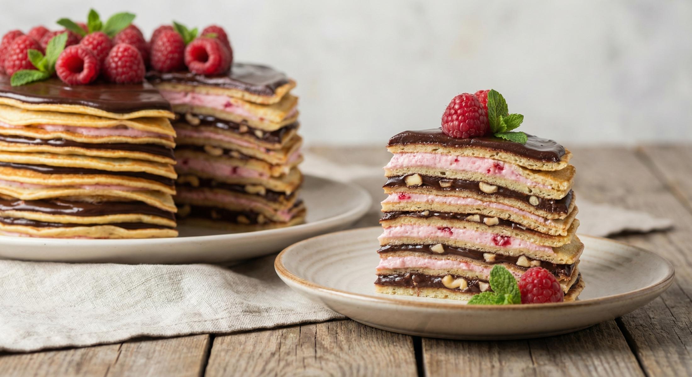 Кто сказал, что блины можно есть только на Масленицу или просто со сметаной? Из них можно создать настоящий праздничный торт! Блинчатый торт с шоколадно-малиновой прослойкой — это невероятно вкусный, нарядный и эффектный десерт, который удивит ваших гостей. Тонкие блинчики, прослоенные нежнейшим малиново-сливочным кремом и ароматным шоколадным соусом, а каждый третий слой — с хрустящими орешками кешью. Это сочетание вкусов и текстур приводит в восторг и детей, и взрослых. Готовится торт из простых продуктов, но выглядит как кондитерский шедевр. Я обожаю этот рецепт за его универсальность: можно менять ягоды и орехи, делая торт каждый раз новым. Давайте готовить этот необычный торт вместе.