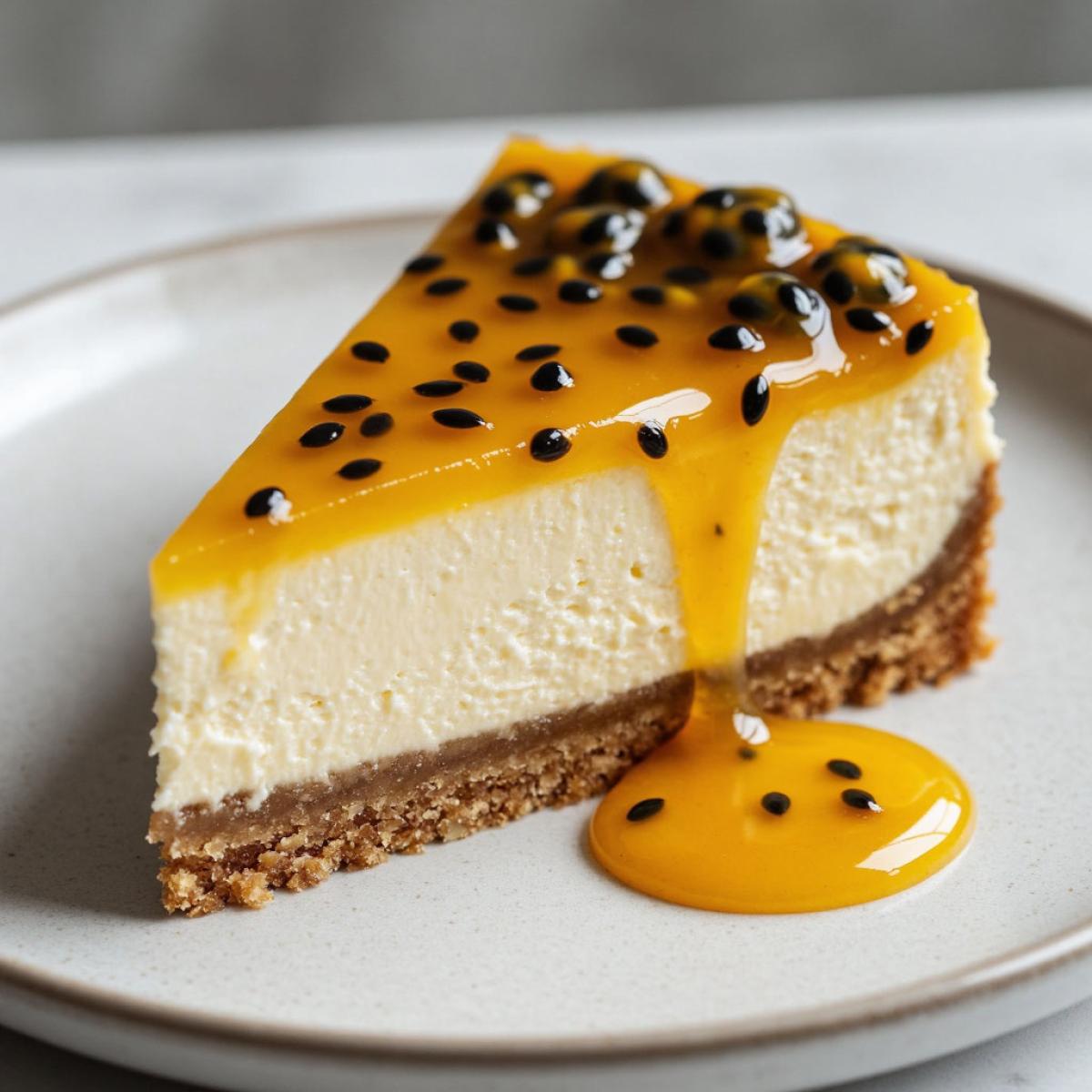 - Маракуйя (или плод страсти) — тропический фрукт с уникальным кисло-сладким вкусом и сильным ароматом. В чизкейке она играет роль не только украшения, но и важного вкусового акцента.