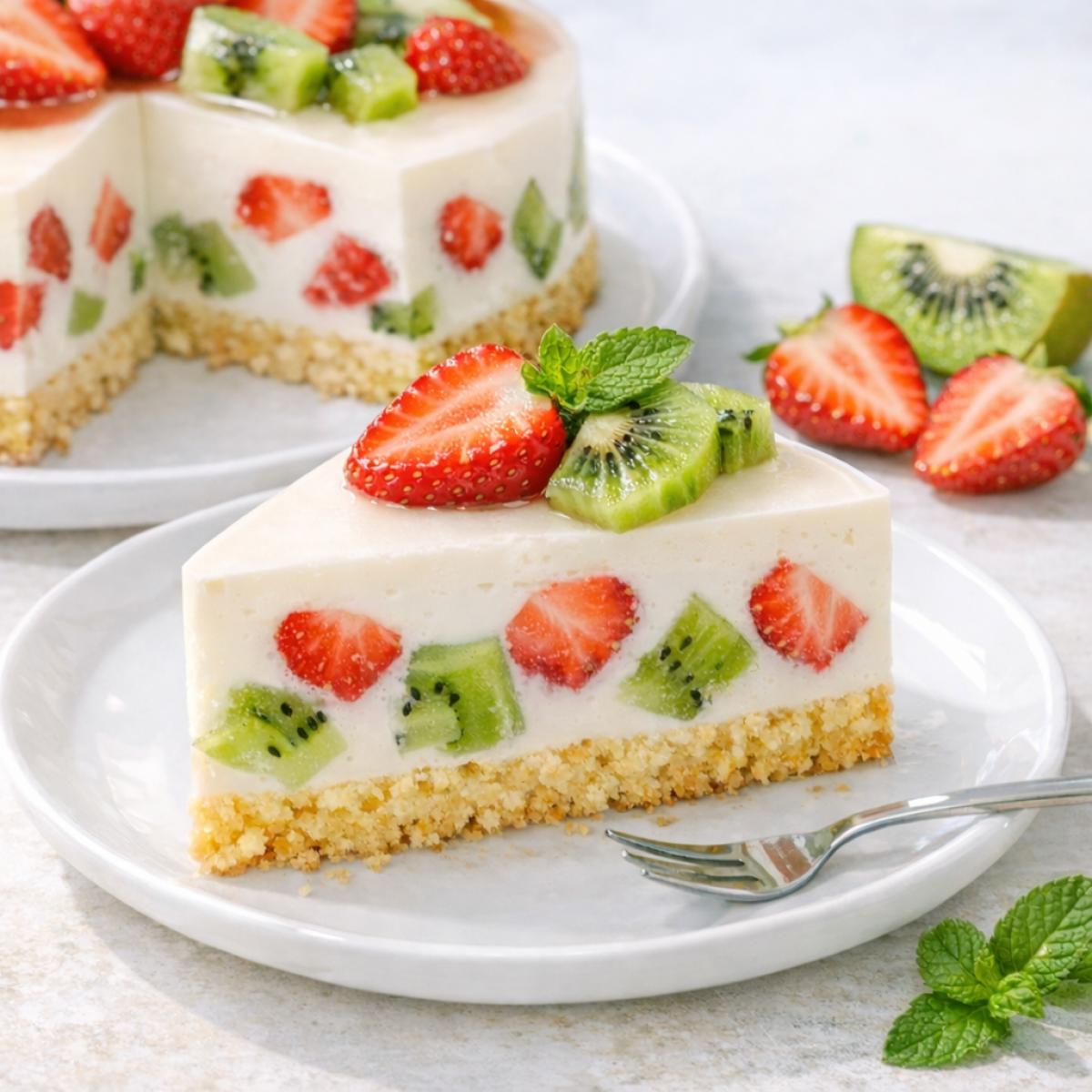 Есть десерты, которые хочется есть ложкой, закрывая глаза от удовольствия. Этот торт - именно такой. Нежный бисквит, сочные кусочки киви и клубники и невероятно воздушное сметанное желе, которое обволакивает всё это великолепие. Легкий, не приторный, освежающий - он словно создан для летних дней, когда хочется чего-то красивого и вкусного, но не слишком тяжелого. В этом десерте нет выпечки верхнего слоя, только бисквитная основа, а всё остальное делает холодильник. Готовится он просто, а выглядит как произведение искусства. Я влюбился в этот рецепт за его универсальность: можно использовать любые ягоды и фрукты, менять их по сезону. Сегодня готовим с киви и клубникой - классическое сочетание кислинки и сладости.