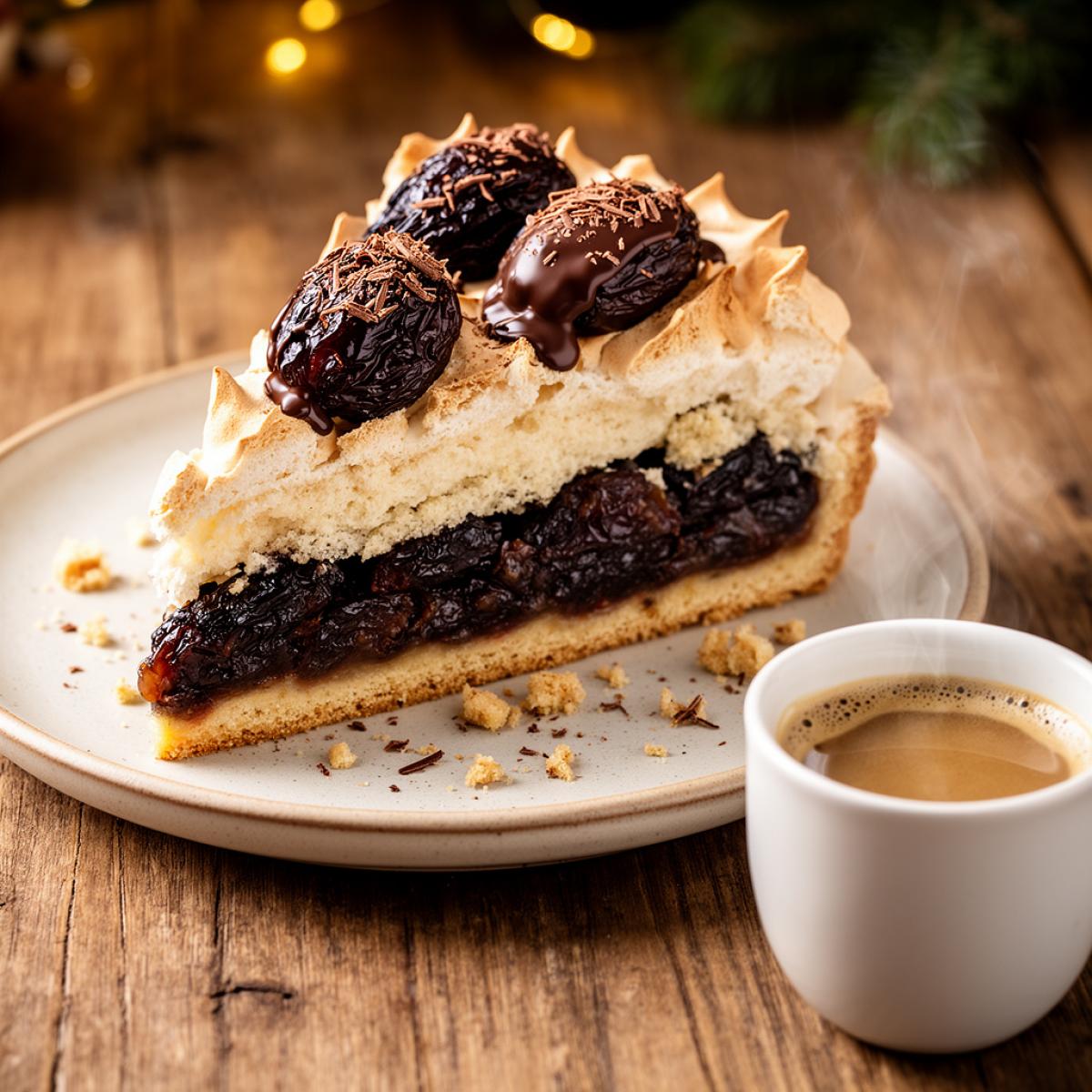 Друзья, приготовление этого торта состоит из нескольких этапов. Сначала готовим песочное тесто и ставим его в холодильник. Затем замачиваем чернослив в коньяке. Потом выпекаем корж до полуготовности, выкладываем на него чернослив, сверху — взбитые белки с сахаром и крахмалом, и допекаем всё вместе. Украшаем черносливом в шоколаде. Важно: безе не должно быть слишком сухим, оно должно остаться нежным внутри. Даём торту полностью остыть — и можно подавать.