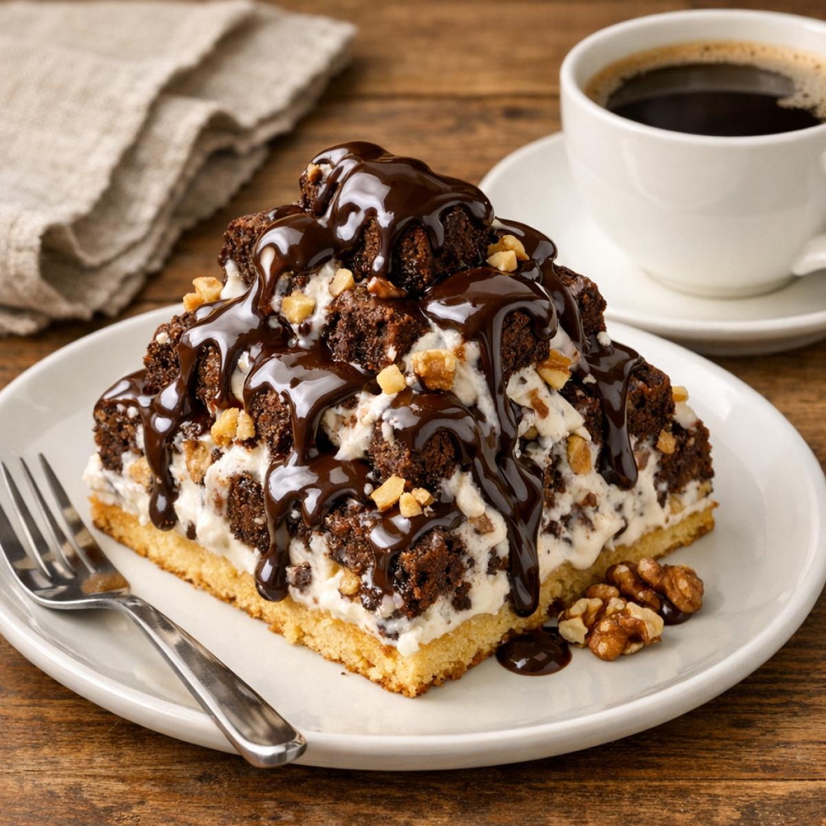 Друзья, приготовление этого торта простое и увлекательное. Сначала печём два коржа: светлый и шоколадный. Светлый оставляем целым, он будет основой. Шоколадный корж режем на кубики. Готовим сметанный крем, взбивая сметану с сахаром. Смазываем светлый корж кремом, посыпаем орехами. Затем каждый шоколадный кубик обмакиваем в крем и выкладываем горкой, пересыпая орехами. Поливаем глазурью и даём пропитаться. Вуаля!