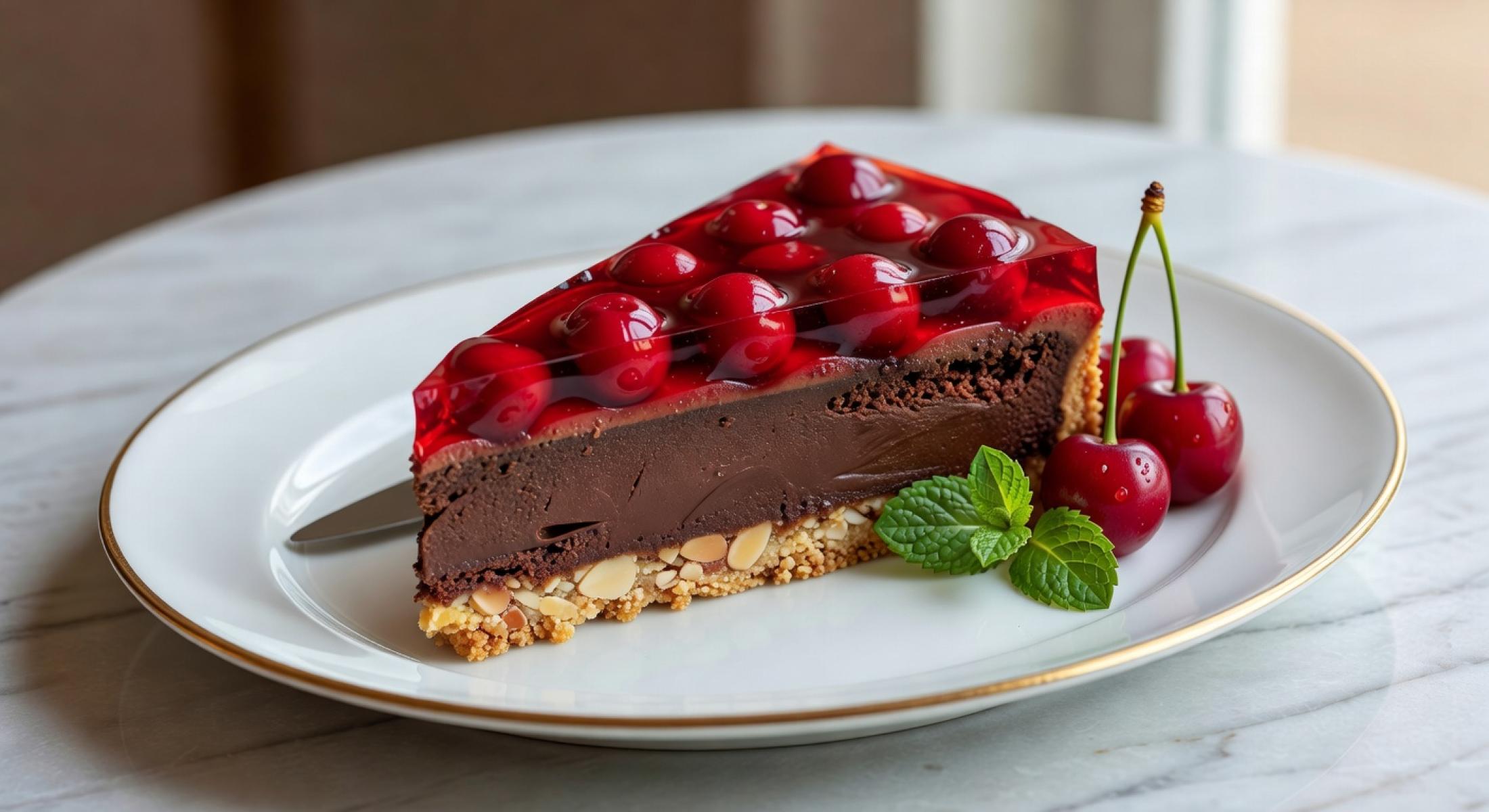 Есть сочетания, которые стали кулинарной классикой, и вишня с шоколадом - одно из них. Кисло-сладкая ягода и благородная горчинка шоколада - это идеальный дуэт. А если добавить к ним рассыпчатую миндальную основу и нежное вишневое желе, получается торт, который невозможно забыть. "Вишня в шоколаде" - это не просто название, это целая гамма вкусов и текстур: песочный корж с ореховым ароматом, шелковистый шоколадный ганаш и яркое, слегка кисловатое желе с целыми ягодами. Этот торт выглядит очень эффектно, но готовится проще, чем кажется. Я влюбился в него с первого кусочка и теперь часто готовлю для особых случаев. Делюсь рецептом, который обязательно станет вашим фаворитом.