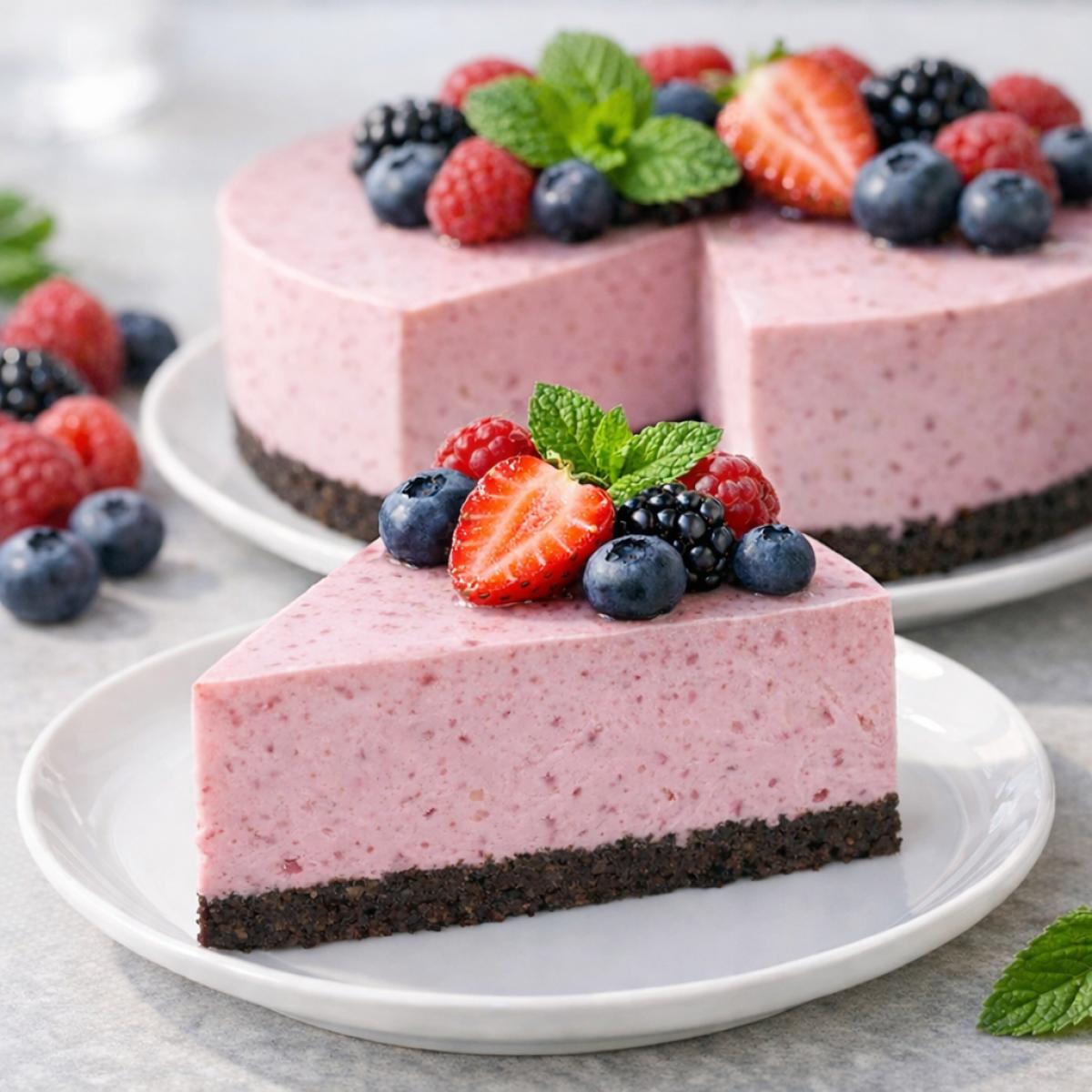 Друзья, весь процесс очень прост. Сначала делаем основу: измельчаем печенье в крошку, смешиваем с растопленным маслом, утрамбовываем в форму и ставим в холодильник. Затем готовим начинку: взбиваем творог с сахаром и сметаной, добавляем ягодное пюре и растворенный желатин. Заливаем начинку на основу и убираем в холодильник до застывания. Всё! Остается только перевернуть торт на блюдо и украсить ягодами.