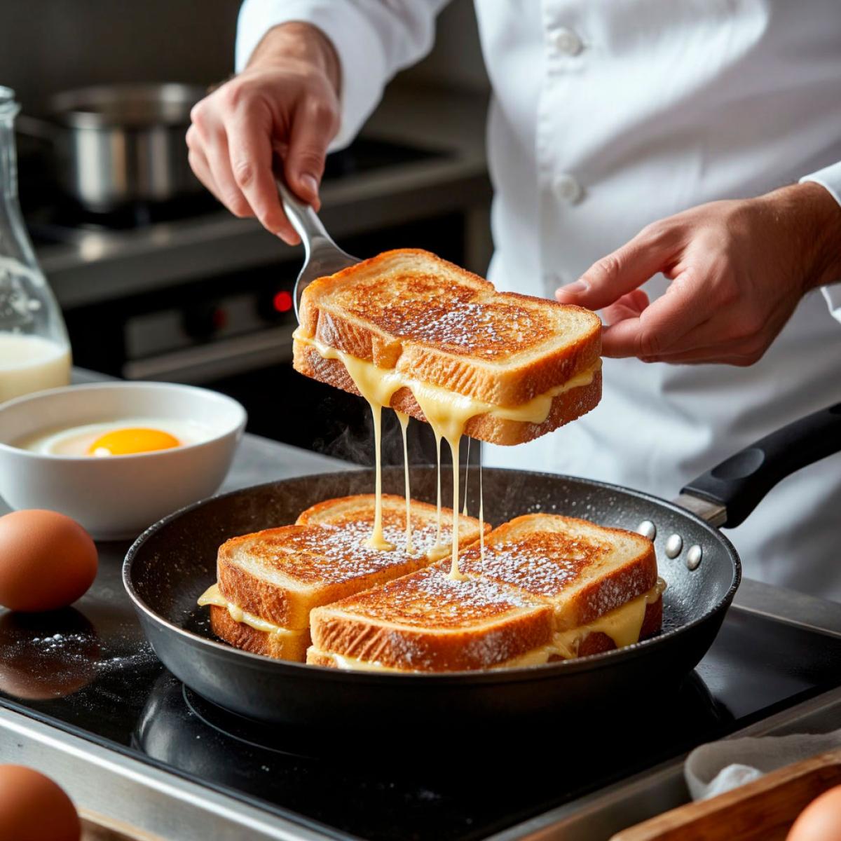 • Кляр имеет значение: В отличие от французских тостов, которые вымачивают долго, хлеб для «Монте-Кристо» окунают быстро. Это позволяет сохранить текстуру мякиша внутри, создавая контраст с хрустящей оболочкой.