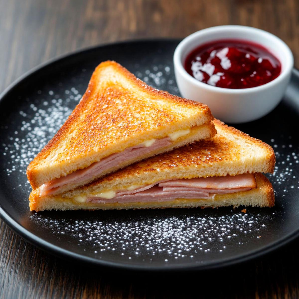 • Джем: Традиционный компаньон «Монте-Кристо» — малиновый или клубничный джем. Также великолепно подходит джем из красной смородины. Кислинка ягод необходима, чтобы «разбить» жирность жареного теста и сыра.