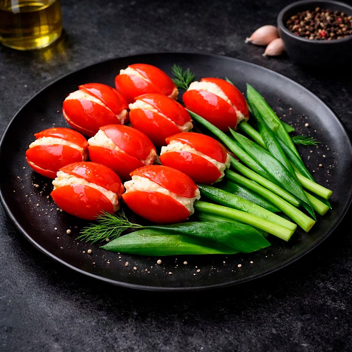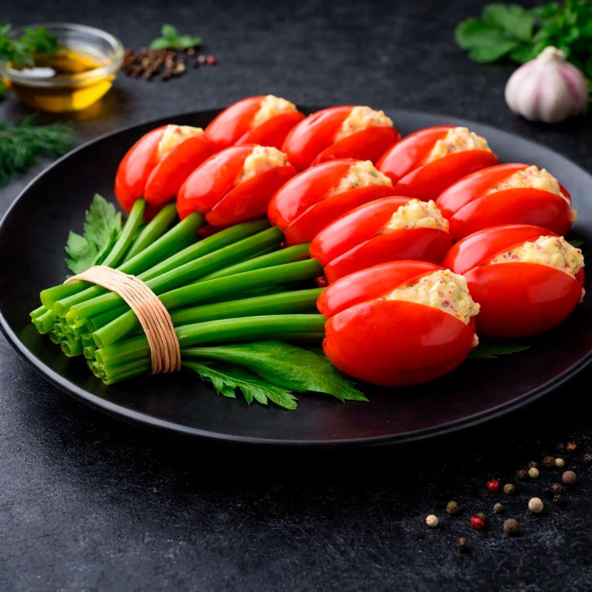 Легкая и эффектная овощная закуска, идеально подходящая для любых торжественных мероприятий. Нежная пастообразная начинка внутри ярких красных помидоров придает блюду нарядный вид и пикантный вкус.