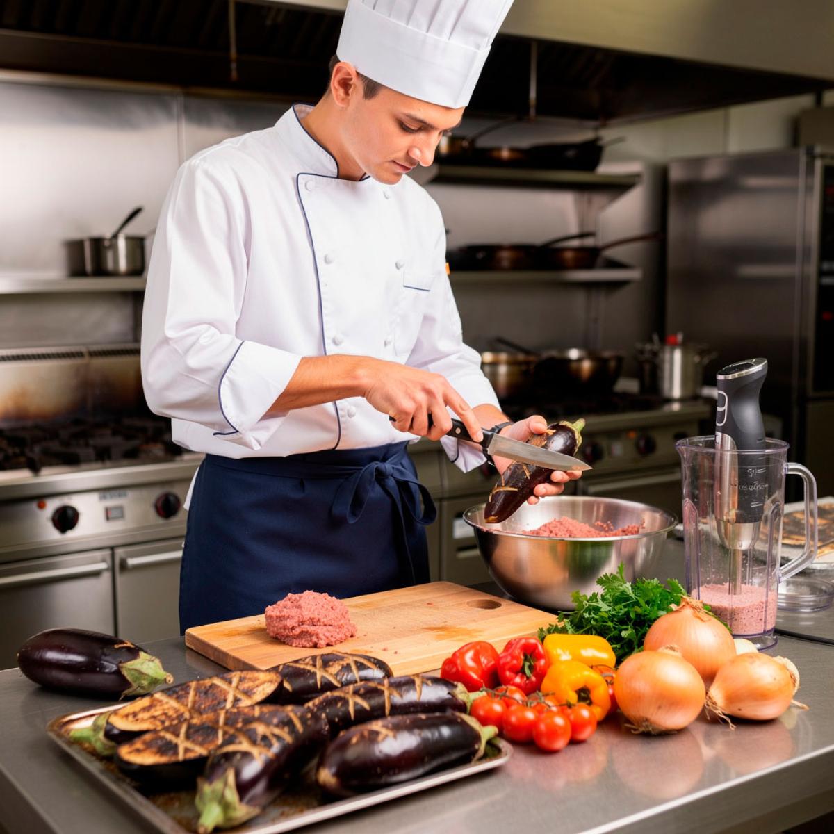 - 1. Подготовка и запекание овощей: Разогрейте духовку до 200°C. Баклажаны и помидоры тщательно вымойте. Баклажаны разрежьте вдоль пополам. На мякоти каждой половинки сделайте глубокий диагональный надрез сеткой, не прорезая кожуру, чтобы позже было легче выбрать мякоть. Помидоры разрежьте пополам или на четвертинки. Перец очистите от семян и нарежьте крупными ломтями. Лук очистите и разрежьте на 4-6 частей.